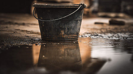 A cinematic wide environmental shot (16:9) capturing three small, galvanized metal buckets stacked a