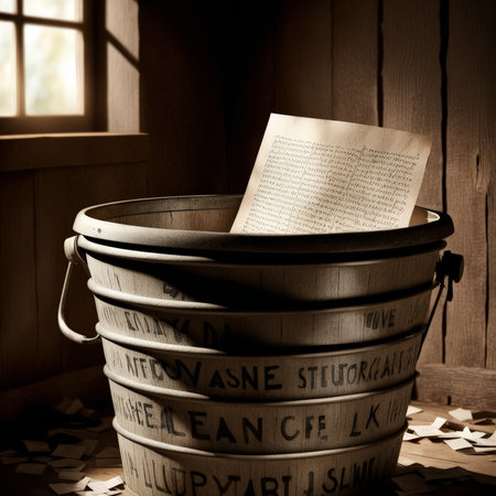A cluttered metal trash can filled with colorful sticky notes sits in a modern office workspace, symbolizing creativity and brainstorming sessions.