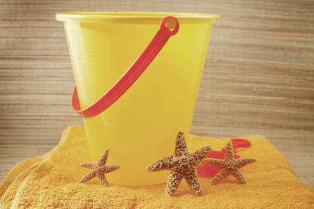 A bright orange sea bucket used as a prop in a cheerful beach photo shoot.