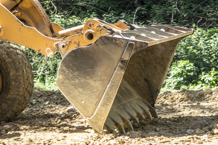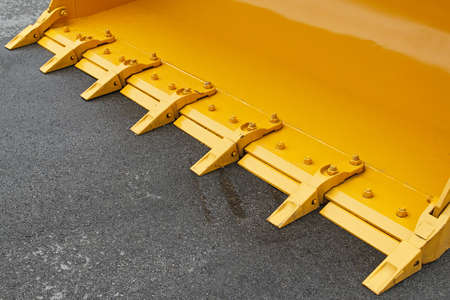 Close up digger excavator bucket bulldozer shovel yellow industrial background