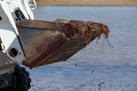 Sand for construction works is collected in a loader bucket.