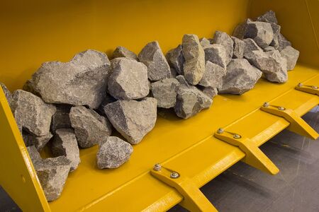 Construction excavator bucket and stones in the showroom. Industry