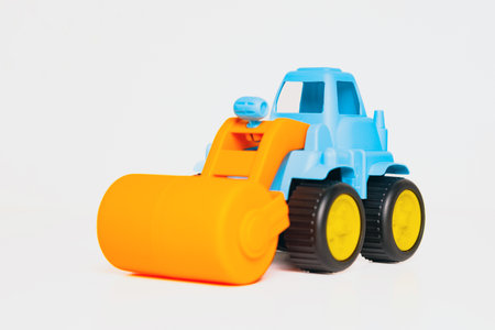 Plastic digger toy isolated on a blue background