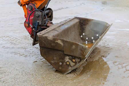 excavator closeup and wet sand, work pause