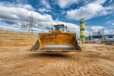 A powerful loader loads sand and crushed stone into a concrete plant. Industrial preparation of concrete. Heavy construction vehicle