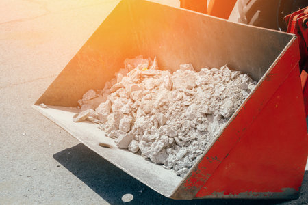 Removal of construction debris. The bucket of the tractor is filled with concrete debris and paving slabs. Dismantling of pavement on the street.