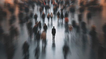 A person stands still in the middle of a crowd. Many blurred figures move around them, creating a sense of chaos and busyness in the space.