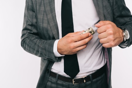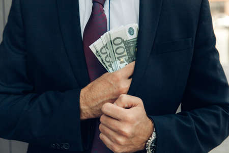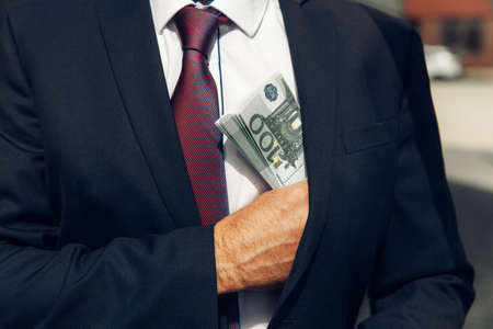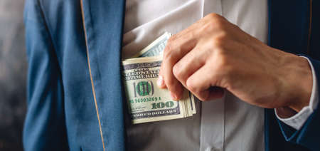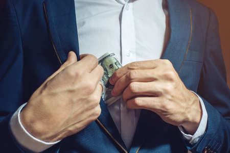 Man in a suit putting a wad of hundred-dollar bills in the inside pocket of his jacket. Close up. The concept of corruption and bribery officials