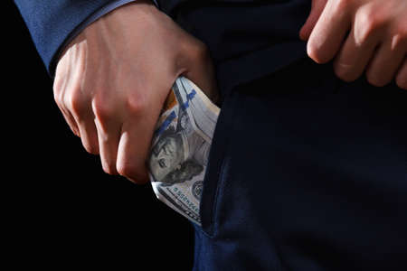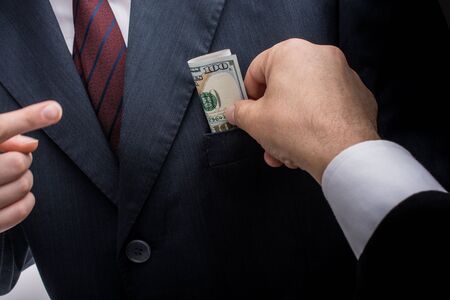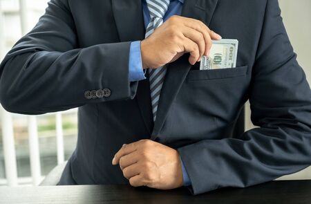 man businessman in suit taking notes, bills of dollars in his pocket as a bribe. the concept of corruption and bribery