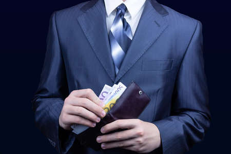 The man in the suit removes the money in the wallet, the businessman wallet Euro