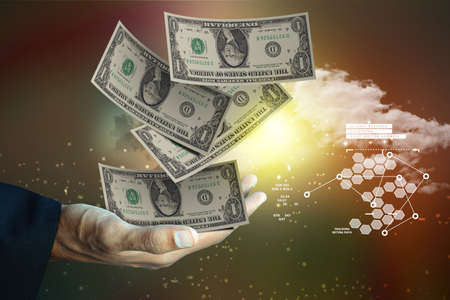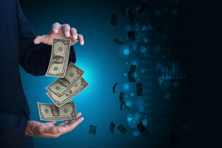 Businessman with money in hand, US dollar (USD) bills - investment, success and profitable business concepts.Forex graph on the business background. A metaphor of international financial consulting
