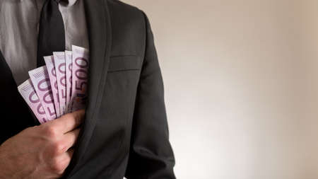 Front view of businessman placing five hundred Euro bills in the inner pocket of his suit jacket. Conceptual of business bribery.