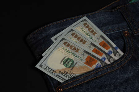 Close up hand of businesswoman holding banknote into pocket. Profitable investment. The exchange of currencies. Money to buy debt securities increase revenue. Hand puts dollar bills in the pocket jeans. The concept of giving a bribe
