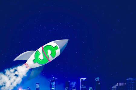 Rocket with a roll of dollars. The concept of financial success and wealth growth in business