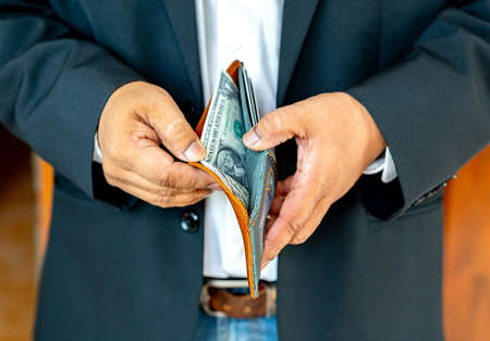 Cloase up The businessman open wallet to take dollar banknotes pay product. Economic and finance concept.