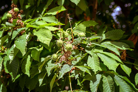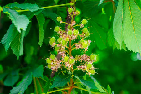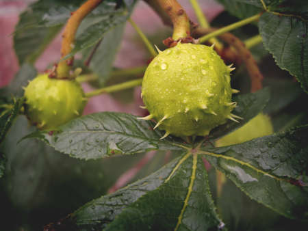 Chestnut tree with young chestnut fruits in a shell with spines. macro photography.