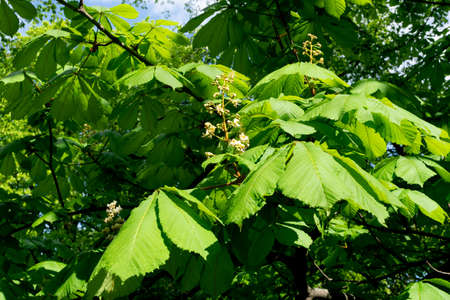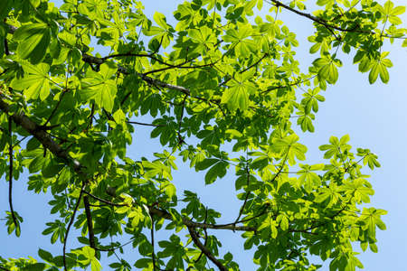 Aesculus hippocastanum, horse chestnut spring green leaves closeup selective focus