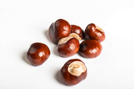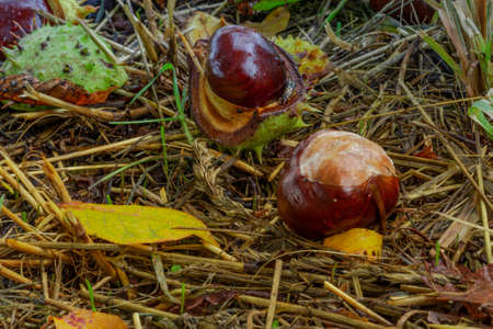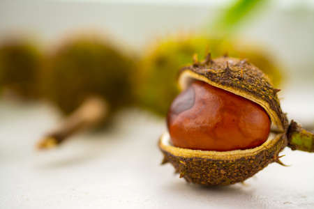 Closeup view of fresh horse chestnuts (Aesculus hippocastanum). Autumn background with heap of ripe brown horse chestnuts and prickly shell on the top