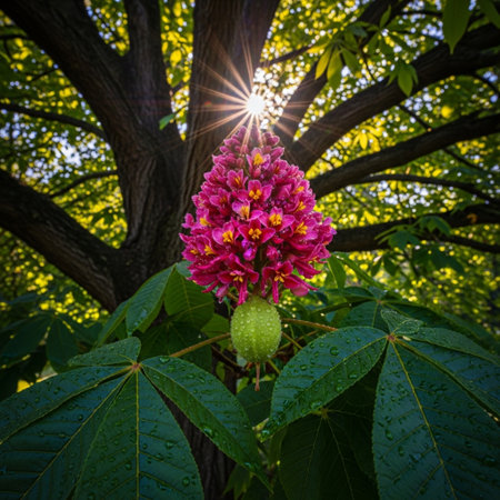 Spring flowering chestnut tree in the park in the afternoon / unusual rare flowers