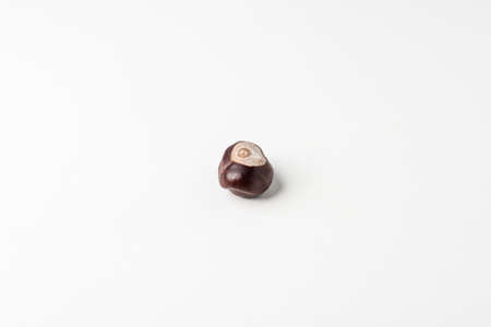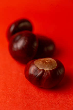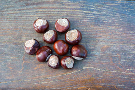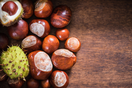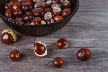 Ripe chestnut on old wooden background close up with copy space. Front view.