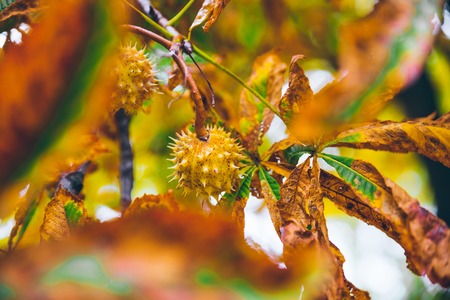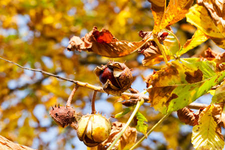brown ripe fruit chestnut hanging on a tree in autumn season. Photo taken closeup. In the background one can see the blue sky and withered foliage