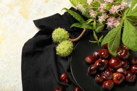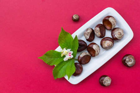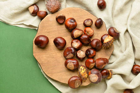 Top view, horse chestnuts (Aesculus hippocastanum) spilled on yellow board, space for text on the right. Autumn background.