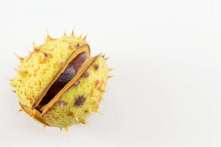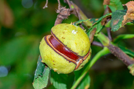 Horse chestnut in cracked peel on tree. Macro photo on conkers.