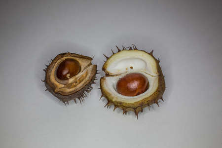 Fresh conkers in and out their spiky capsule from a horse chestnut tree also called horse-chestnut, buckeye, conker tree or Spanish chestnut on on slate for nature illustrations