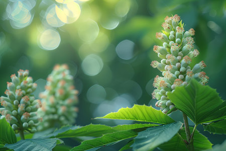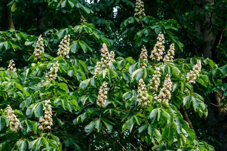 Aesculus hippocastanum horse chestnut tree in bloom, group of white flowering flowers and green leaves on branches