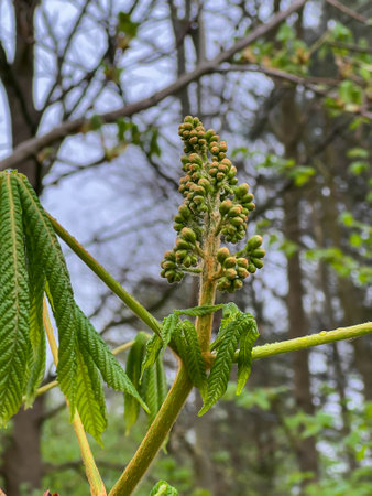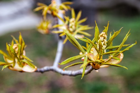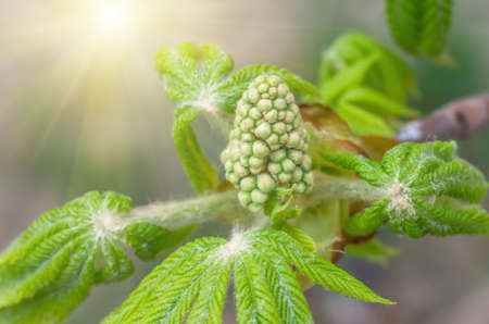 young leaves and flowers, buds of a chestnut, are born from a bud on branchesin tree in the spring