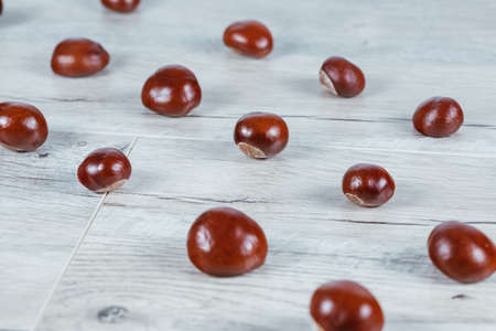 chestnuts on wooden background. Autumn concept with copy space, minimal flat lay