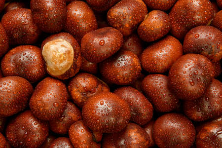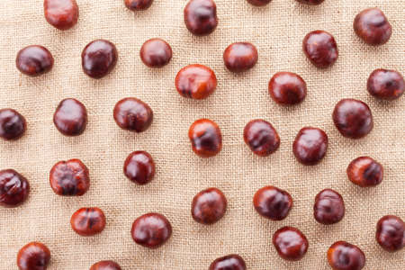 Ripe chestnuts close up. Raw Chestnuts for Christmas. Fresh sweet chestnut. top wiew. Food autumn background.
