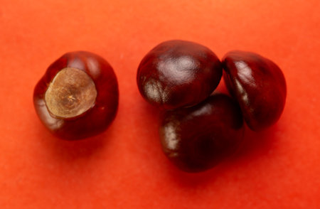 Two glossy horse chestnuts rest in a palm, reflecting the golden light of autumn. This shot evokes the simple pleasure of natures offerings and seasonal shifts.