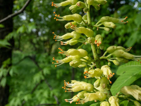 Macro shot of yellow to green flowers with long stamens of the Ohio buckeye (Aesculus glabra) in bright sunlight in the spring