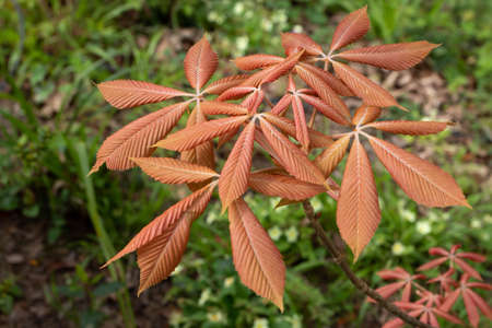 Aesculus sylvatica or painted buckeye red colored young leaves in the spring