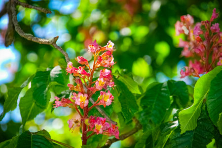 Spring floral background. Blooming pink chestnut close-up. Blurred green background with bokeh. Shallow depth of field, selective focus, copy space