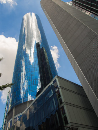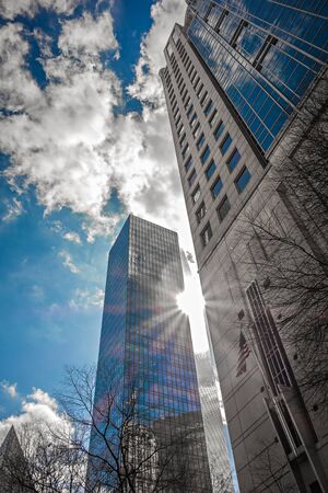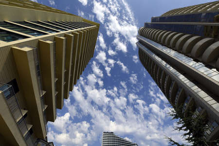 Blue sky and clouds reflected on the glass of office business buildings in the city center on a bright sunny day.