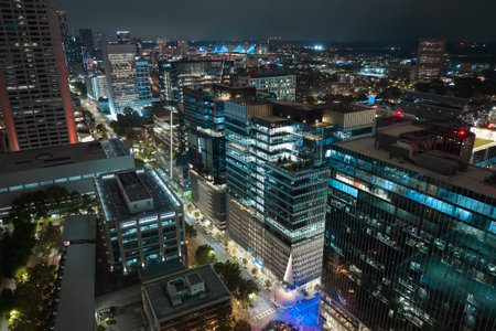 Night urban landscape of downtown district of Atlanta city in Georgia, USA. Skyline with brightly illuminated high skyscraper buildings in modern american megapolis