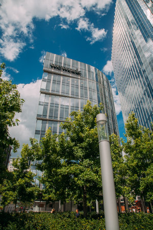 Warsaw, Poland - June 27, 2022: Business architecture. City center. Downtown industry. Modern high glassy coworking Wework building in sunny daylight.