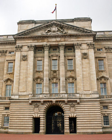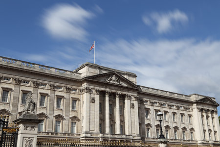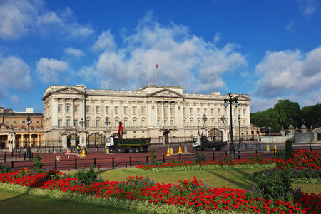 Scenic view with the facade of Buckingham Palace, London royal residence of the monarch of the United Kingdom
