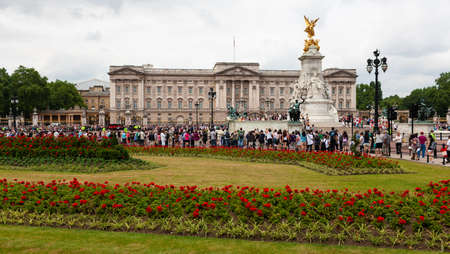LONDON - JUNE 1: Tourist visit Buckingham Palace on June 1, 2011 in London, England. Buckingham Palace has served as the official London residence of Britain's sovereigns since 1837.