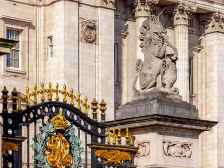 Unicorn sculpture - symbol of Scotland on walls of Buckingham palace in London, UK
