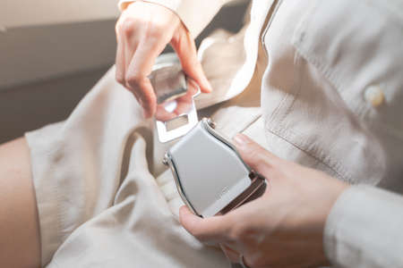 Close up of women fasten seat belt on the airplane.