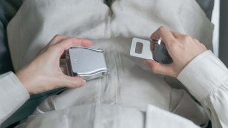 Passenger's hands are tying the seat belts on the plane to prepare before flying.