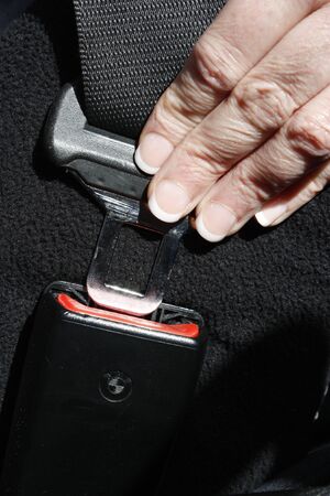 Female hand with a lock of the seat belt, focus on the thumb, shallow depth of focus.