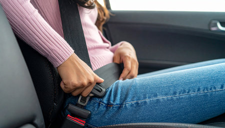 A close-up shot of a person fastening their seatbelt in a modern car, highlighting the importance of road safety and responsible driving. Essential for travel and daily commute imagery.