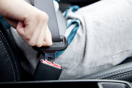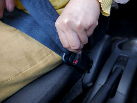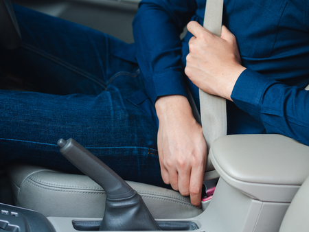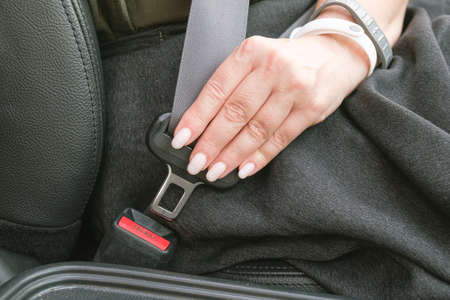 Lady putting car seat belt before driving, close up at belt buckle, safe drive concept