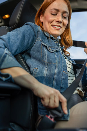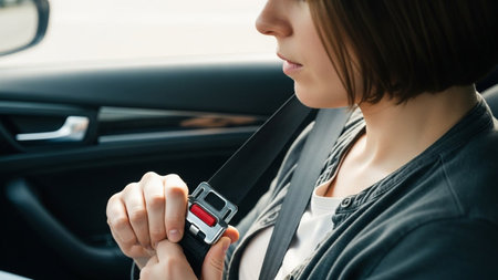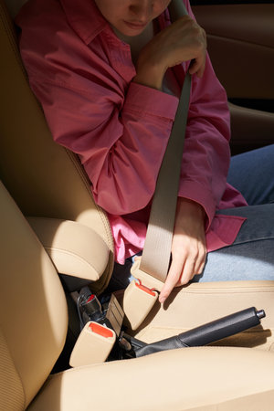A focused young woman fastens her seatbelt securely inside a car. This image highlights road safety, responsible driving, and preparation for travel. It conveys themes of protection.