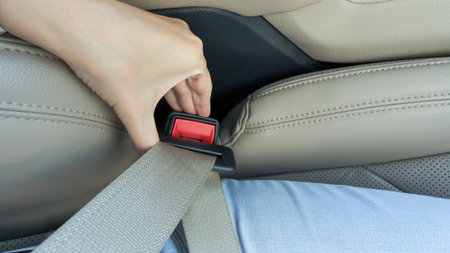 Hand is positioned to fasten car seatbelt buckle in a contemporary vehicle, highlighting essential safety features and promoting responsible driving habits