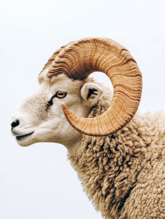 A beautiful ram showcases its impressive large curved horns and fluffy textured wool, perfectly posed against a clean white studio background.